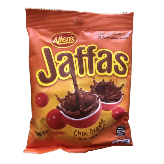 Allen’s Jaffas are chocolate balls covered in an orange flavoured shell. Bite into the crispy shell and let the choc orange flavour melt in your mouth.