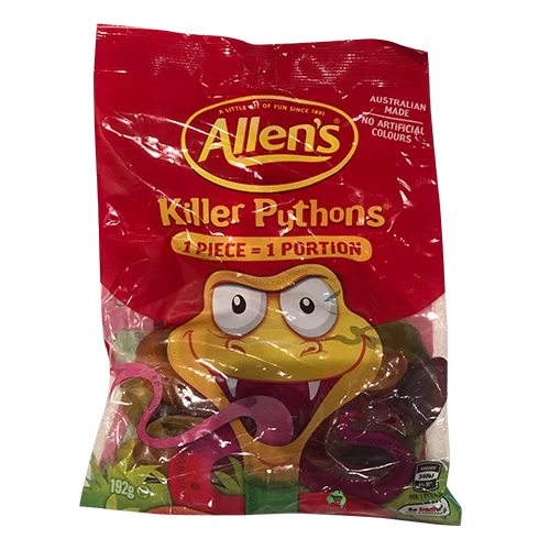Allen’s Killer Pythons come in a variety of natural colours and fun fruity flavours. Taste the Allen’s adventure by stretching your Killer Pythons as far as you can before taking each bite colour by colour.