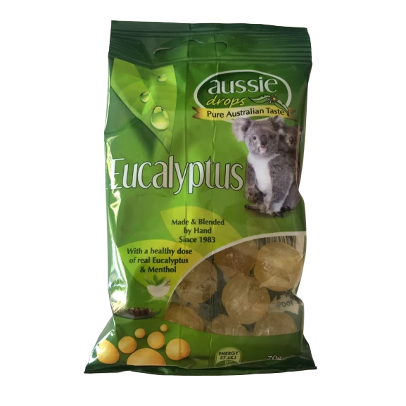 Aussie Drops Eucalyptus, Made and blended by hand since 1983, with a healthy dose of real Eucalyptus and Menthol. Pure Australian taste.