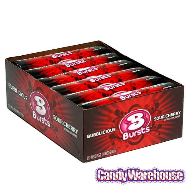 Display box contains 12 Sour Cherry Storm Bubblicious Gum Bursts Packs, each with 7 pieces.