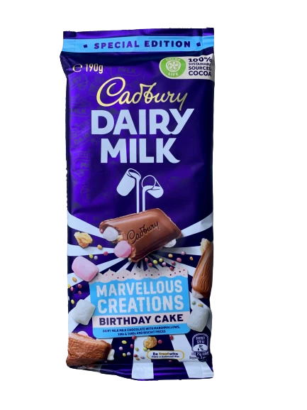 Cadbury Dairy Milk Marvellous Creations Birthday Cake – Dairy Milk Milk Chocolate with marshmallows, 100s & 1000s and biscuit pieces. 100% sustainably sourced cocoa.