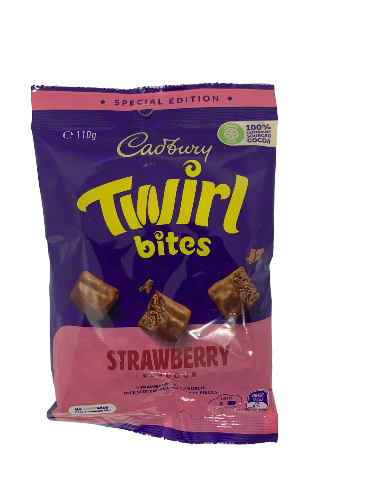 Cadbury Twirl Strawberry Bites are strawberry flavoured bite size pieces of milk chocolate TWIRL. They’re terrifically curly and scrumptiously swirly.