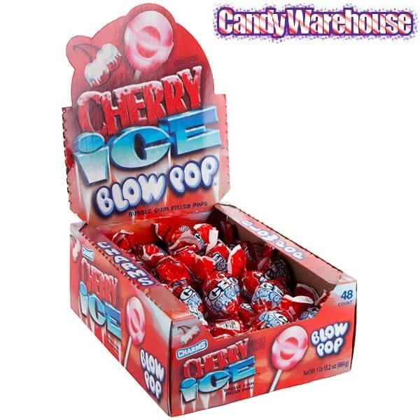 Display box contains 48 Charms Cherry Ice Blow Pops.