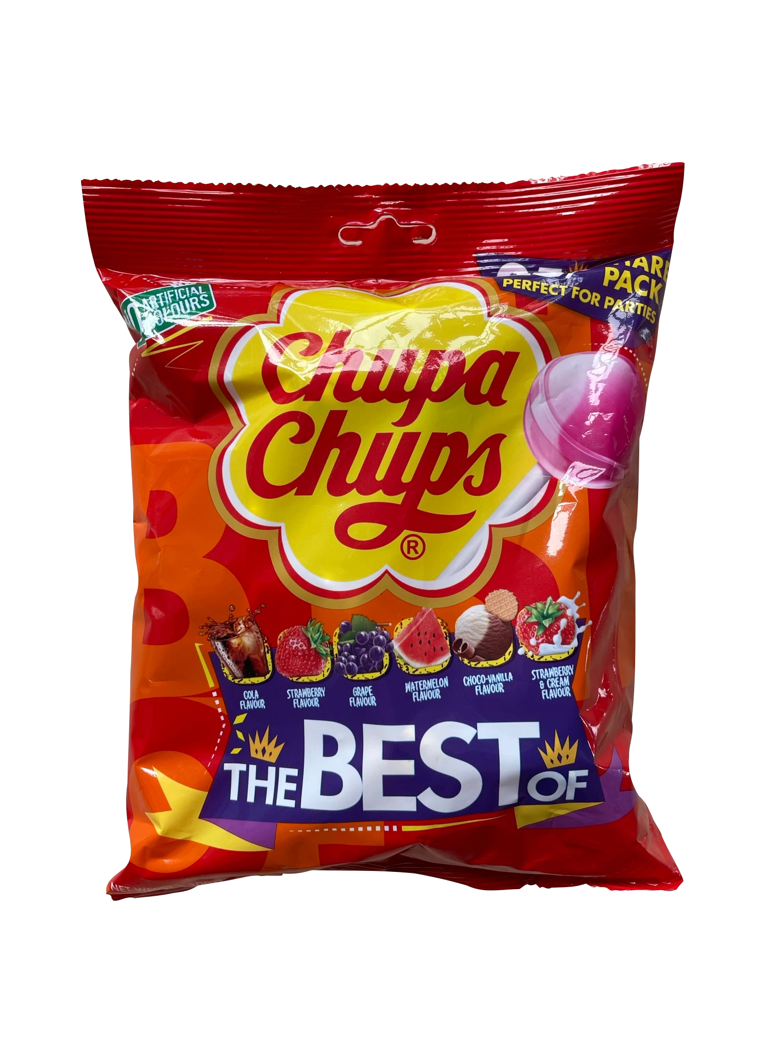 5 of your favourite Chupa Chups flavours Strawberry, Strawberry & Cream, Watermelon, Grape and Cola in a 25 unit bag. No artificial colours. Perfect for parties and celebrations!