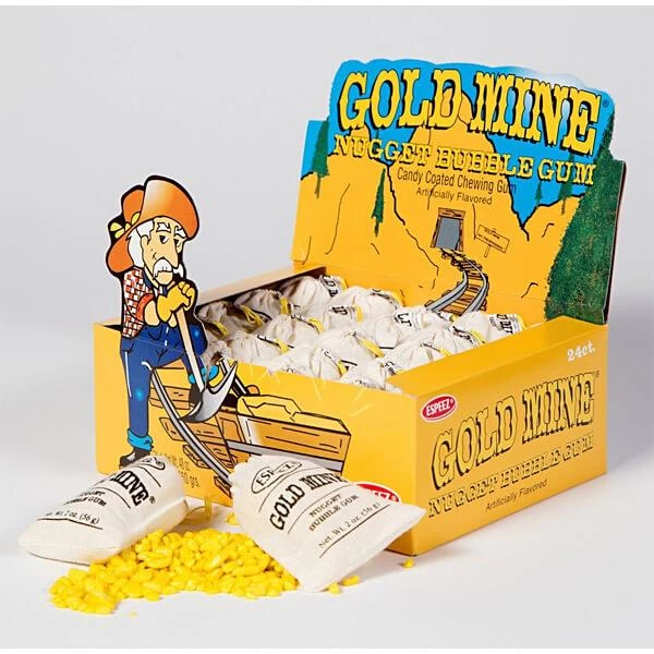 Display box contains 24 Gold Mine Gold Rocks Nugget Bubble Gum Satchels, each with a net weight of 2 ounces.