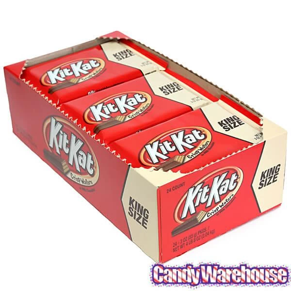 Deal a major blow to between-meals hunger with Kit Kat king size candy bars. Sometimes a 1.5-ounce Kitkat bar just whets your appetite and leaves you wanting more, more, more! Itβs for those famished moments that the king size Kit Kat bar was born. Each individually wrapped bar gives you 3 scrumptious ounces of layered crispy wafers caressed by creamy milk chocolate. A super satisfying king-size Kit Kat candy bar is the ideal way to tame a snack attack when less is not more. Tear off the perforated top of this 24-piece box, and stash it in a drawer or cupboard for easy grab-and-go access on the run. Buying Kit Kat bars in bulk from Candy Warehouse is a smart way to save time and money, plus you always have plenty to share.