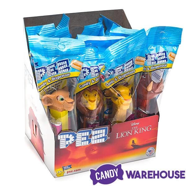 Display box contains 12 Lion King PEZ Candy Packs, each with 1 dispenser and 2 candy cartridges.