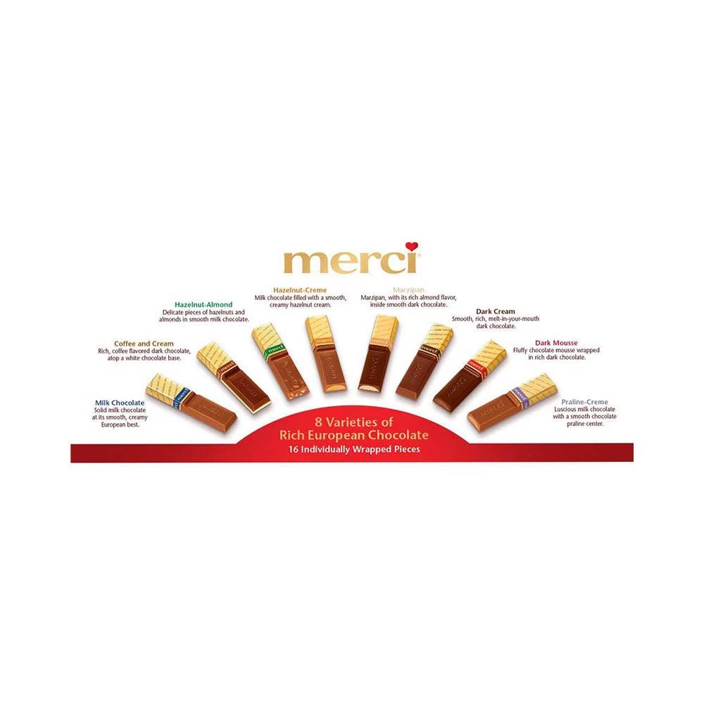 Box contains 7 ounces of Merci Finest Assortment of European Chocolates, that’s 16 pieces.