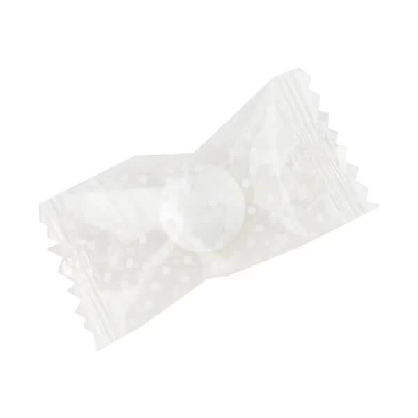 Case contains 1,000 White Mints in Clear Wrappers with White Dots.