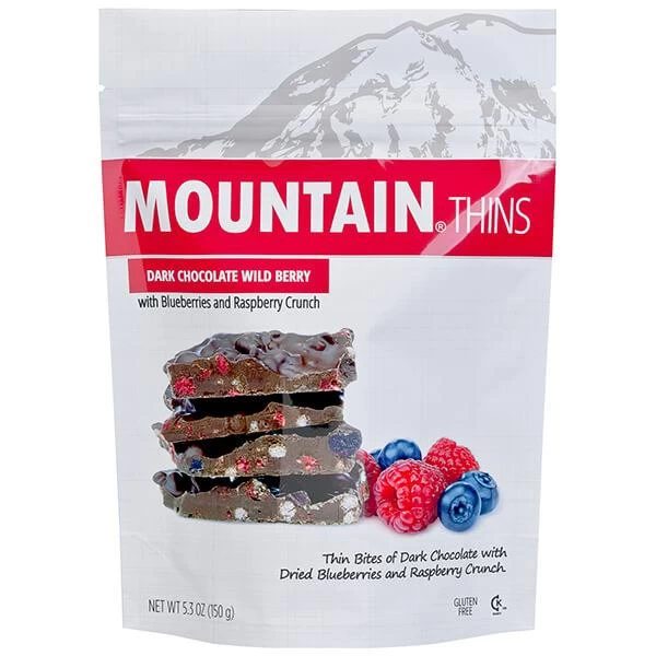 Bag contains 5.3 ounces of Dark Chocolate Wild Berry Mountains Thins Candy.