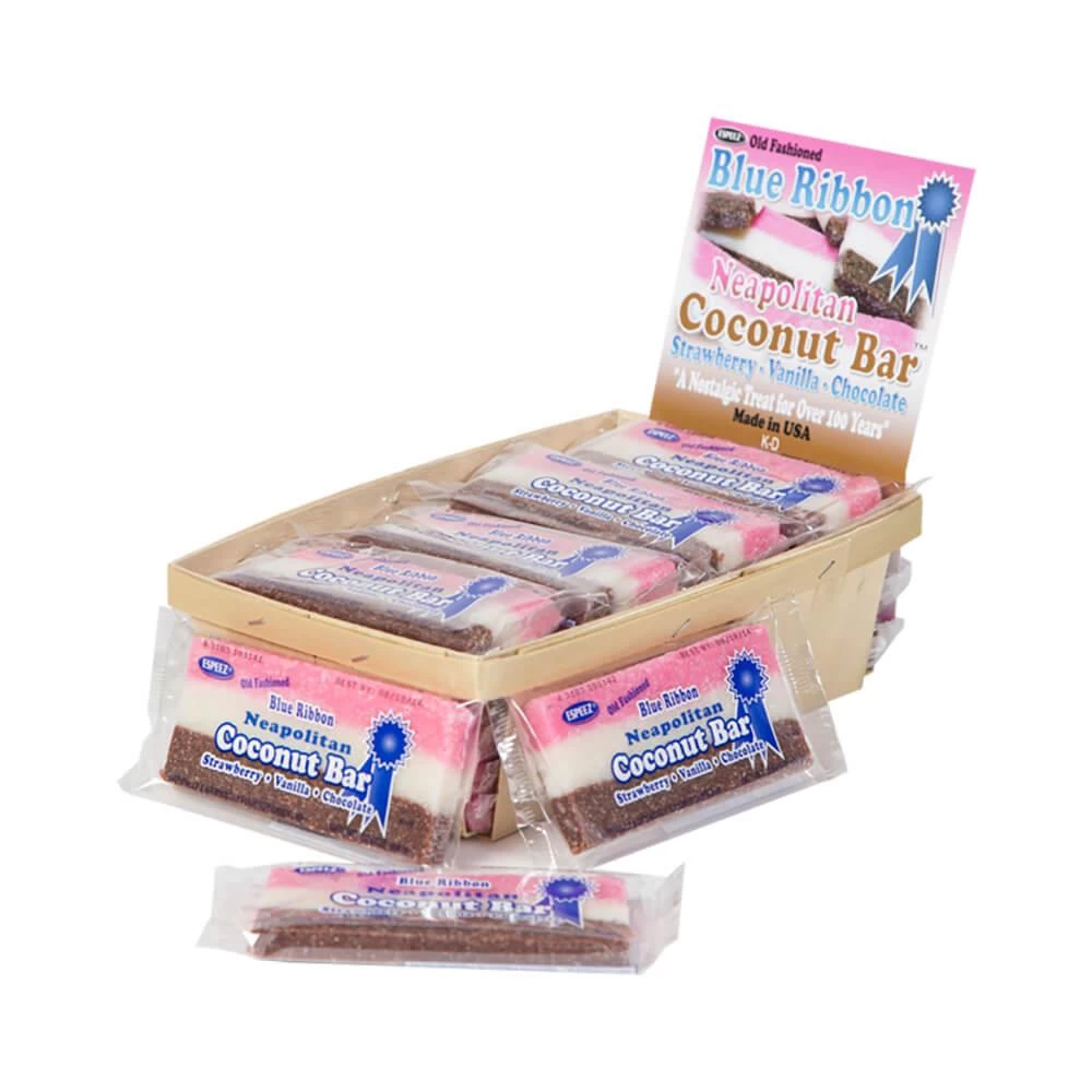 Display box contains 24 Neapolitan 3 Color Coconut Slices Candy Bars, each with a net weight of 2.25 ounces.