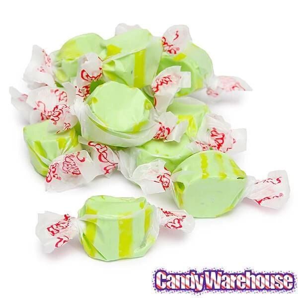 Bag contains 2.5 pounds of Gourmet Green Pear Salt Water Taffy Candy.