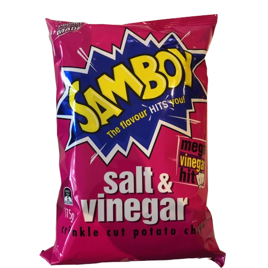 Salt & Vinegar flavoured potato chips. Whether snacking or entertaining, everyone can be hit with their favourite Samboy flavour.