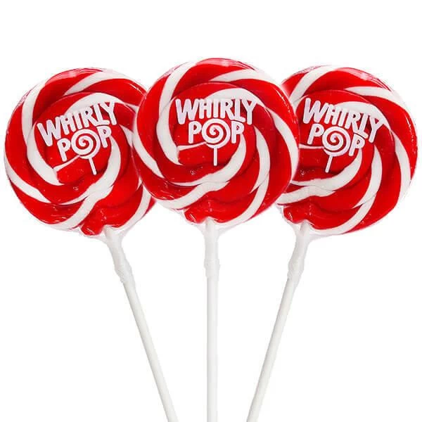 Elegant Whirly pops in swirling red and white colors. These lollipops have a fabulous cherry flavor and feature a sturdy, longer-than-average stick that helps you enjoy them without accidentally licking the knuckles and fingers of your hand that holds the stick.